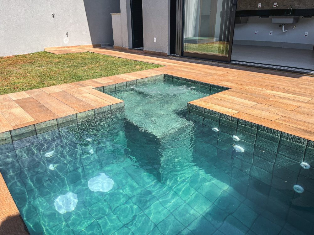 - Piscina de alvenaria revestida com cerâmica, equipada com hidromassagem e preparada para aquecimento