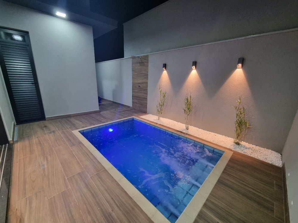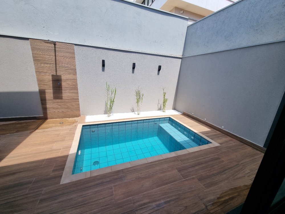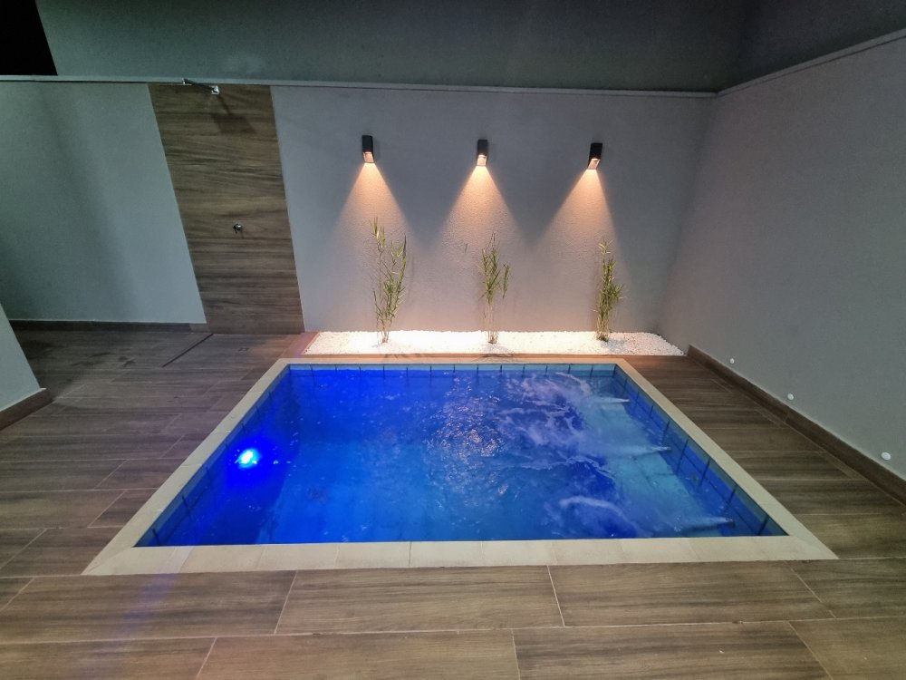 - Piscina equipada com sistema completo de aquecimento, filtro, hidromassagem e iluminação. O espaço também conta com chuveirão, oferecendo uma área de lazer sofisticada e bem equipada.
