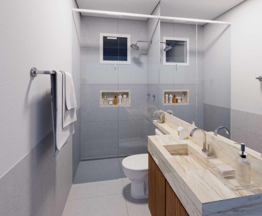 - Banheiro Social: Elegante e funcional, criando um ambiente de relaxamento.
