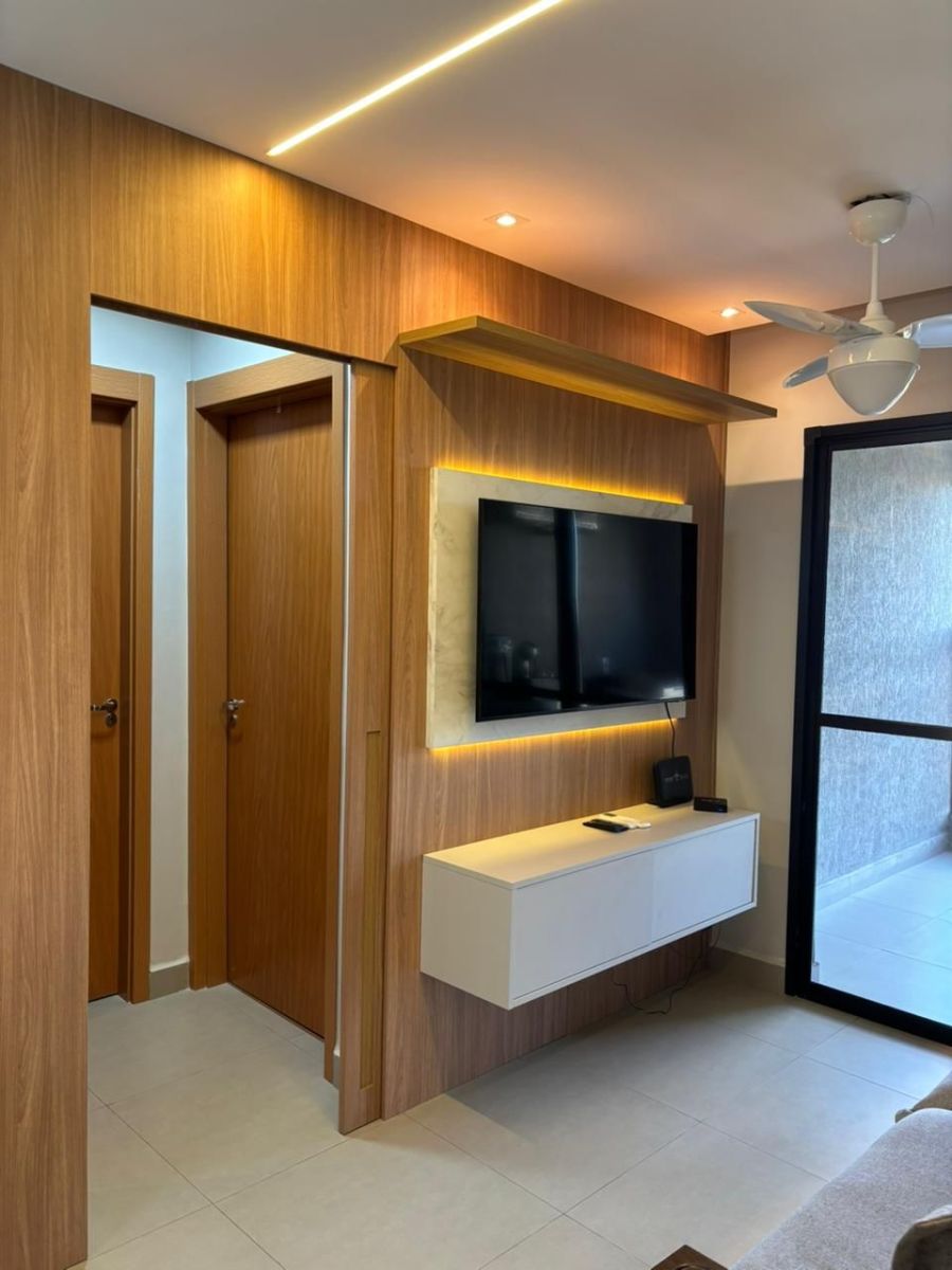 A unidade conta com 2 dormitórios, sendo 1 suíte, e um total de 2 banheiros. A área social integra-se a uma sacada, proporcionando ventilação natural e iluminação adequada aos ambientes. O imóvel dispõe de 2 vagas de garagem, diferencial relevante para a tipologia e localização.