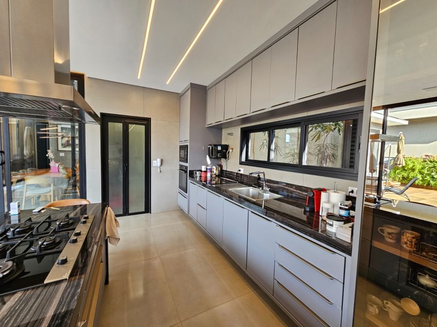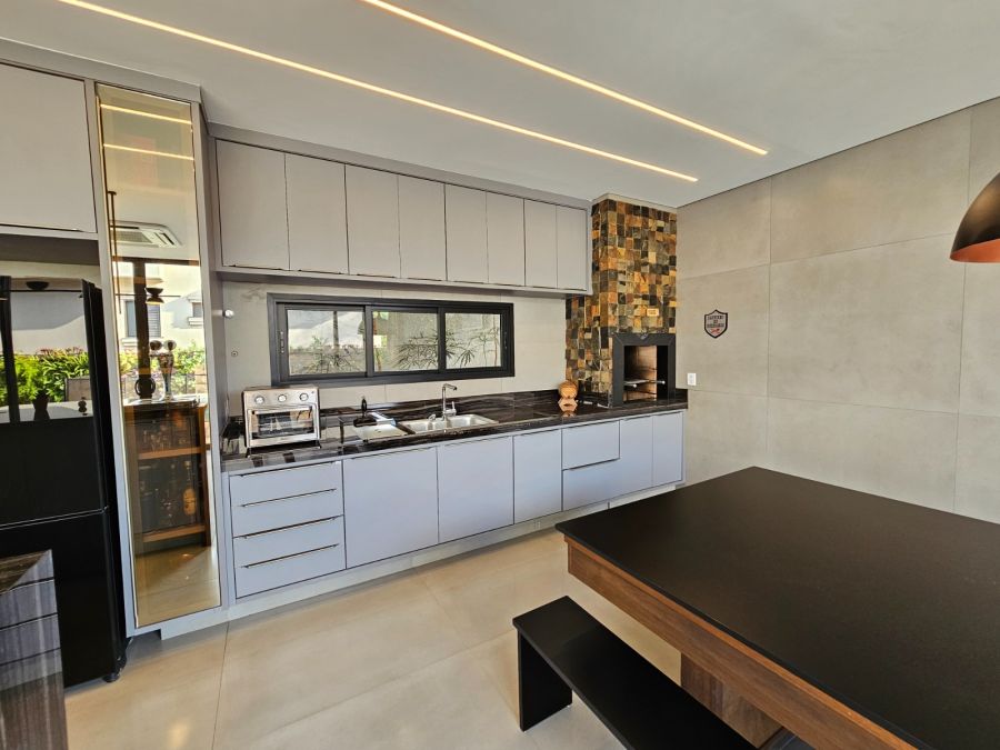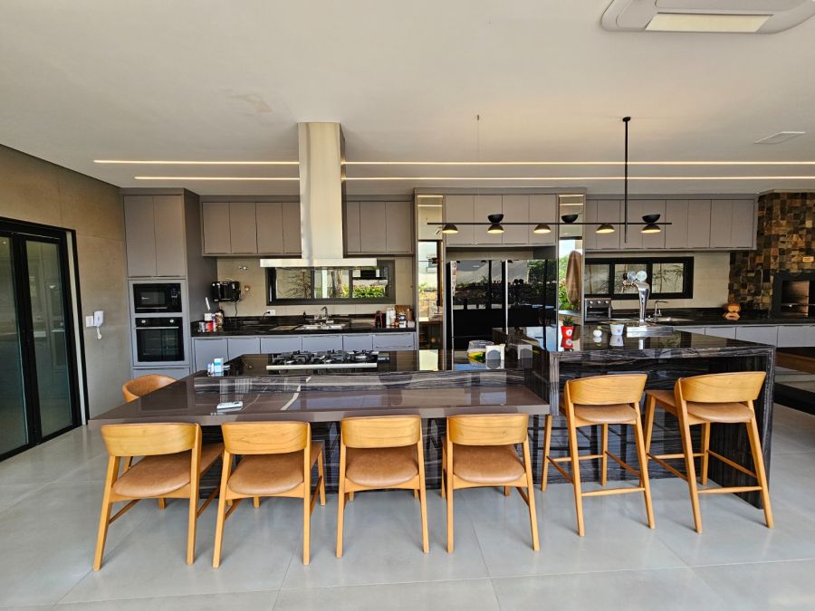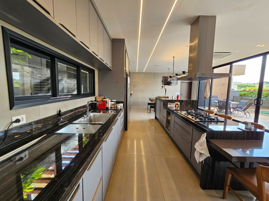 Cozinha em ilha com bancada de 4m, integrada à área gourmet