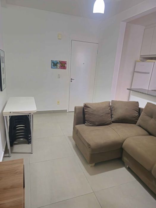 A unidade possui uma área privativa de 53 m², distribuída de forma funcional para otimização dos espaços. A planta compreende dois dormitórios, sendo uma suíte, sala de estar, banheiro social e uma vaga de garagem vinculada. O acabamento e o mobiliário conferem ao imóvel um perfil executivo e moderno.