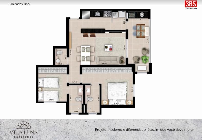 No Vila Luna, a integração de ambientes de forma inteligente é uma característica marcante. Os apartamentos de 81,66m² foram projetados para oferecer o máximo de conforto, com 2 suítes e 2 vagas de garagem por unidade. A varanda gourmet de 12m² proporciona momentos agradáveis de convívio com amigos e familiares. As salas e cozinhas americanas trazem modernidade ao projeto.